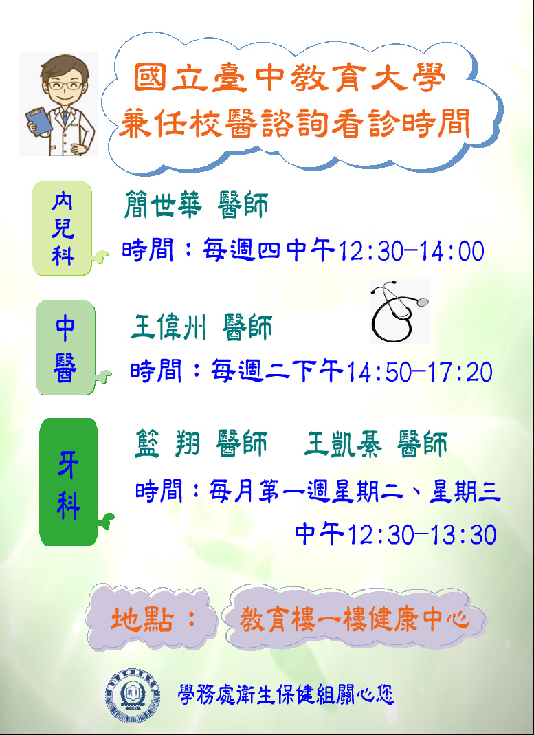 一、各科兼任校醫諮詢看診從本(112)年7月起時間如下: (一)內兒科:每週四中午12:30-14:00。 (二)中醫:每週二下午14:50-17:20。 (三)牙醫:每月第一週星期二、星期三中午12:30-13:30。 二、地點:教育樓一樓健康中心(B105教室)。 三、若有任何問題請洽學務處衛保組,分機:3174、3175。