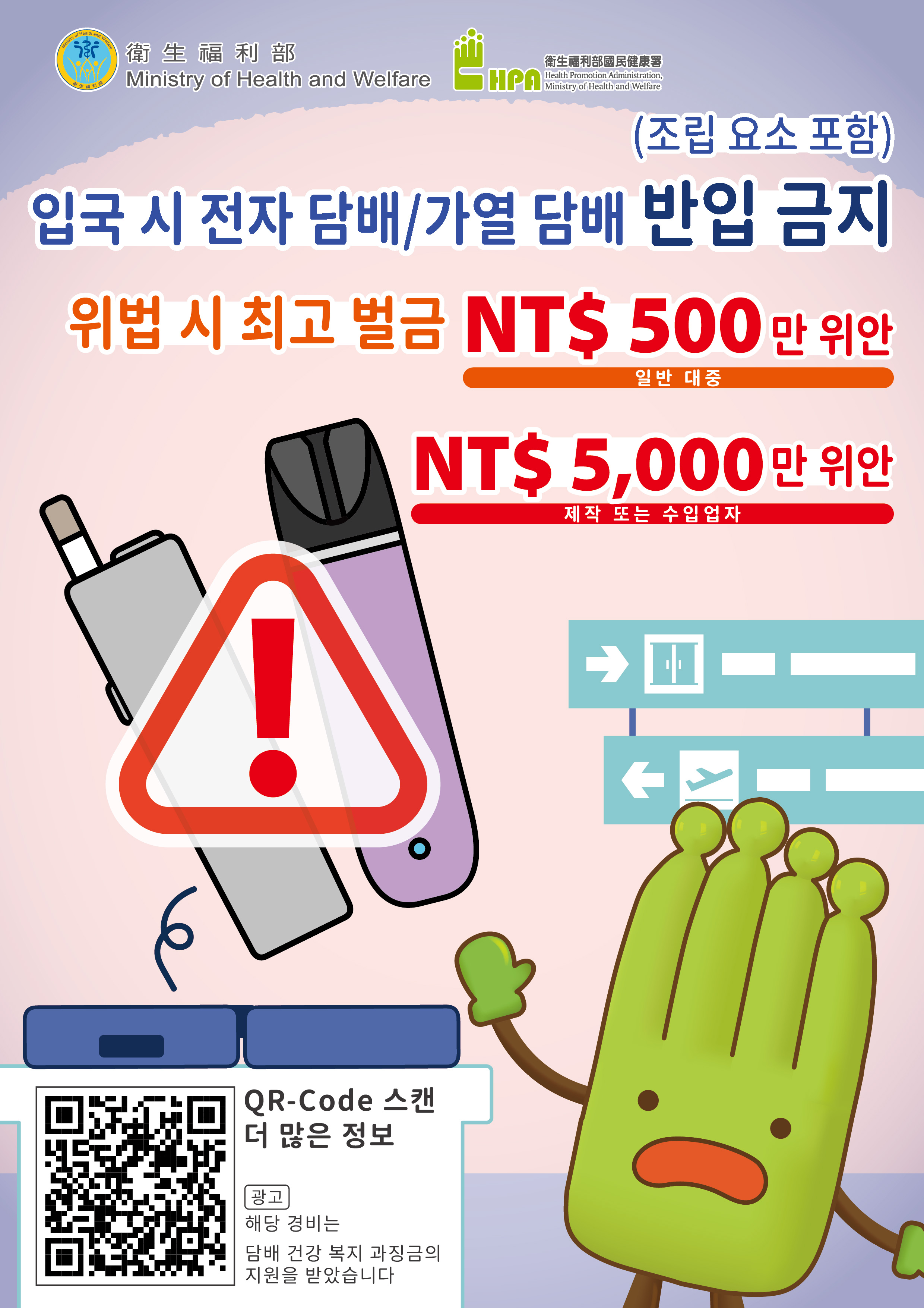 二、菸害防制法第15條第1項第3款及同條第2項規定,任何人不得輸入電子煙或未經核定通過健康風險評估審查之指定菸品(加熱菸)及其必要之組合元件,為宣導出入境旅客禁止攜帶電子煙或加熱菸入境,中央已跨部會加強宣導。