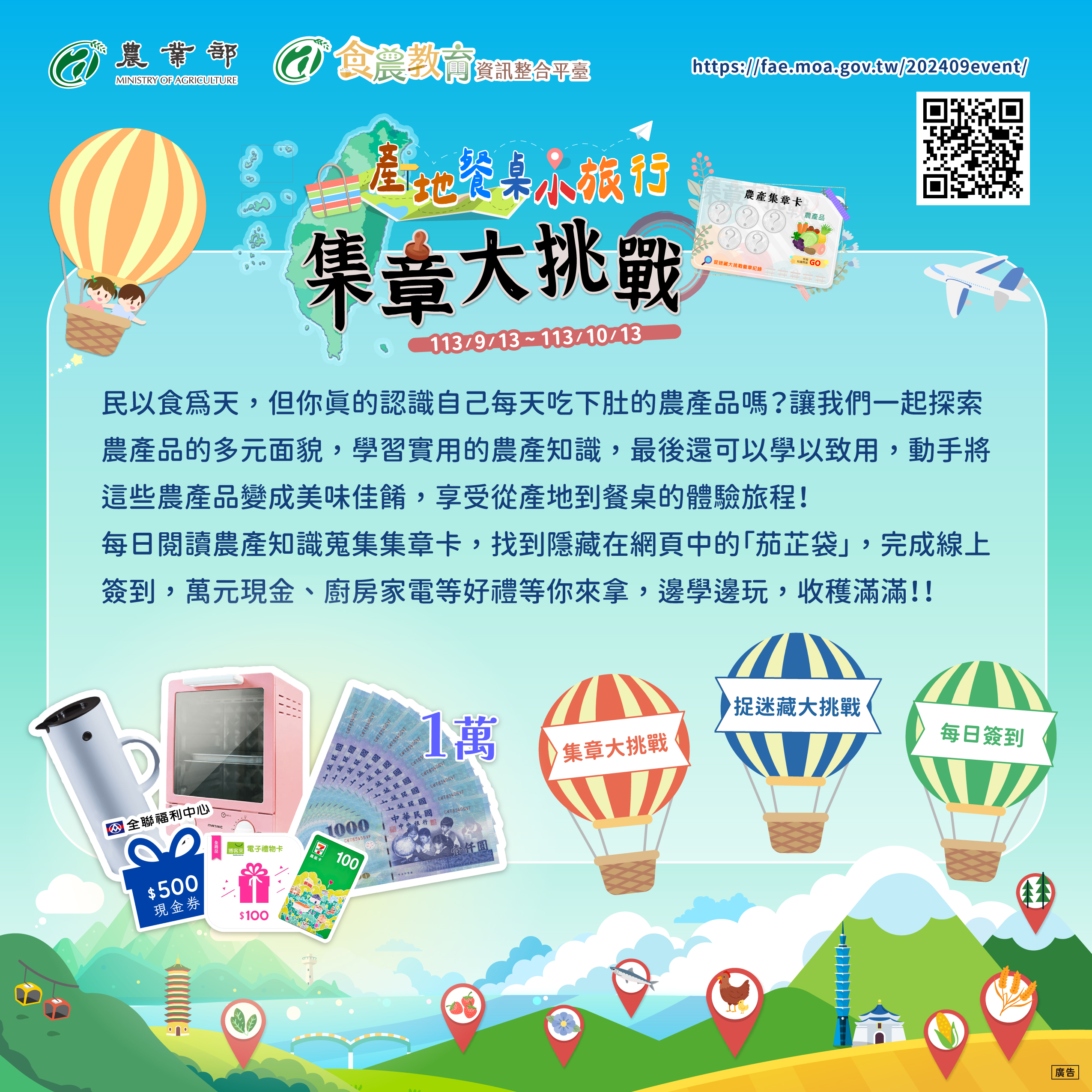 (二)為使大眾瞭解食農教育並探索在地農產,辦理「產地到餐桌小旅行 集章大挑戰」食農教育推廣活動(網址:https://fae.moa.gov.tw/202409event/),提供食農教育相關知識集章挑戰、網頁捉迷藏、簽到打卡等遊戲,參與活動即可抽獎,包含萬元現金、廚房家電、禮券等多項好禮,歡迎踴躍參與。